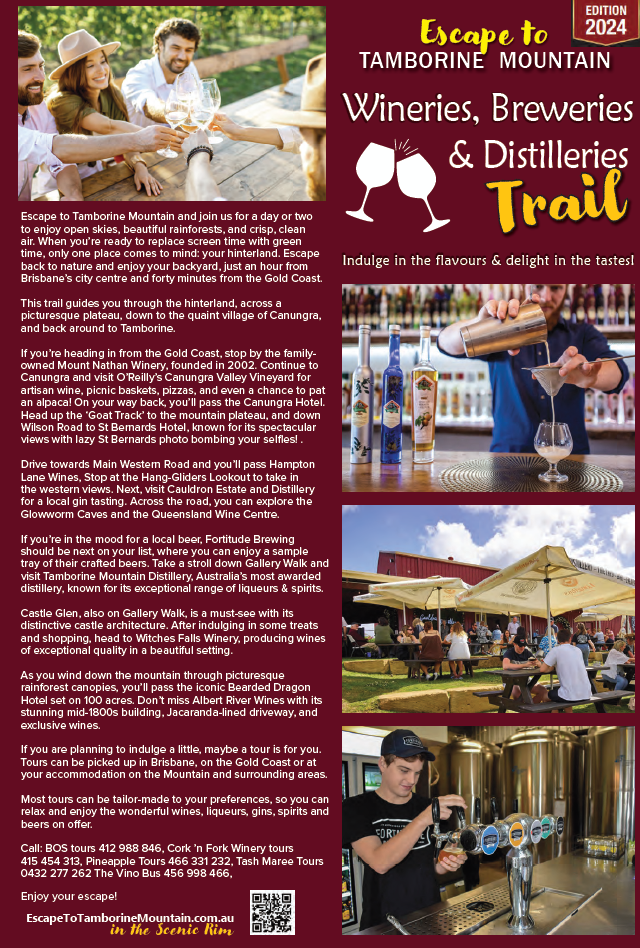 Are you a winery, brewery, or distillery in the Tamborine Mountain region? The Wineries, Breweries and Distilleries Trail Guide is your key to reaching a wider audience and boosting your business.